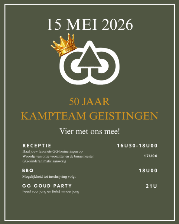 Haal samen met (oude) bekenden de leukste GG-herinneringen nog eens boven! We heffen samen het glas met onze voorzitter en de burgemeester. En voor de kleinste bezoekers zal er animatie voorzien zijn, volledig in GG-thema. Zodat wij ons alvast geen zorgen hoeven te maken over de toekomst van het kamp!